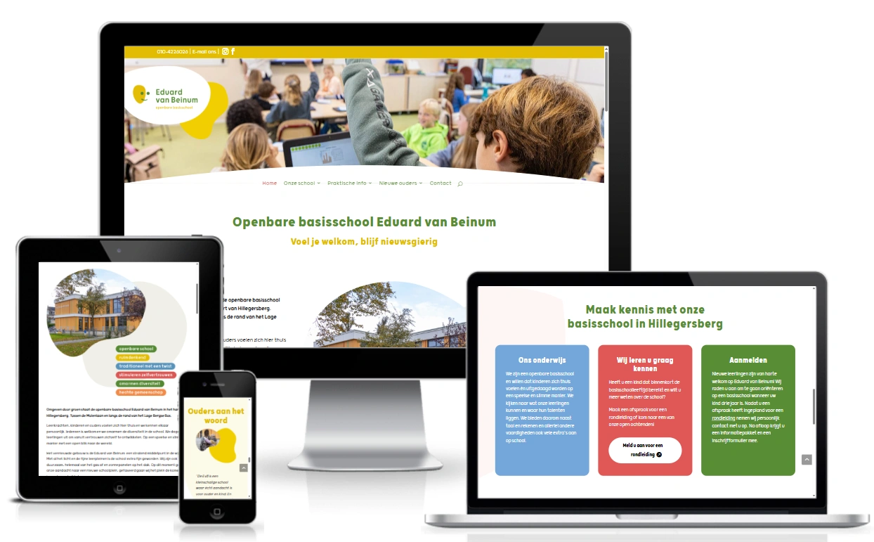 The Public Primary School Eduard van Beinum in Rotterdam had commissioned a colorful, playful new corporate identity and wanted a website that matched it perfectly.